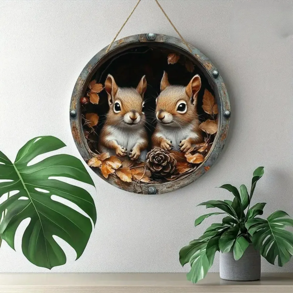 2D Circular Wooden Logo with Autumn Squirrel Theme, Suitable for Home, Bar, Room, Coffee Shop, Office Decoration, Holiday Gifts